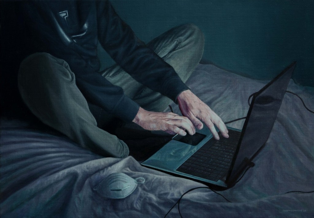 Onog trenutka kad sam pronašao njegov Instagram profil, postalo mi je sasvim jasno da, iako nisu nastale baš ovih dana, njegove slike tokom trenutnog vanrednog stanja poprimaju sasvim novo značenje. Sva ta asocijalnost, izolovanost i odsustvo neposredne komunikacije poslužili su mu kao inspiracija za radove koje (ni)sam imao prilike da vidim na ULUS-ovoj izložbi „de-lighted/ Osvetljeni ekranskom svetlošću“. I sav taj svijet isprekidan tehnologijom sasvim izgleda drugačije, svjestan je toga i Ivan, u ovim trenucima u kojima nas tehnologija povezuje još više nego ranije.